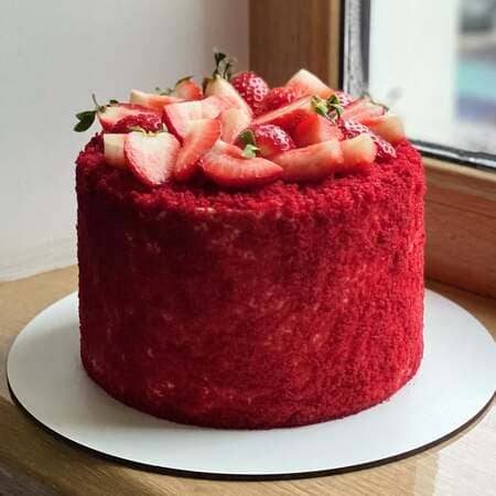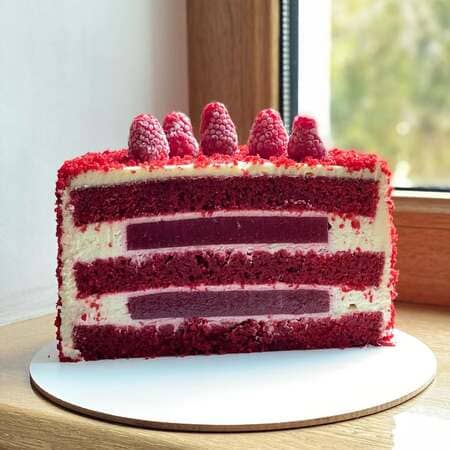 Торт Красный бархат сочетает нежный бисквит со сливочным творожным кремом, создавая мягкий и насыщенный вкус.