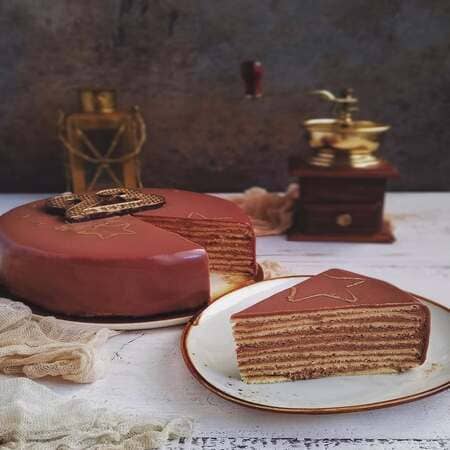 Торт Добош – это классический венгерский многослойный торт из тонких бисквитных лепешек, шоколадного масляного крема и хрустящей карамельной верхушки.